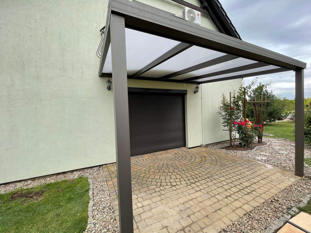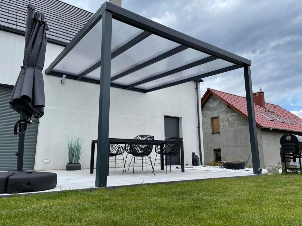 Systém hliníkové pergoly zasklený dutinkovým polykarbonátem 16mm - čirý nebo mléčný.